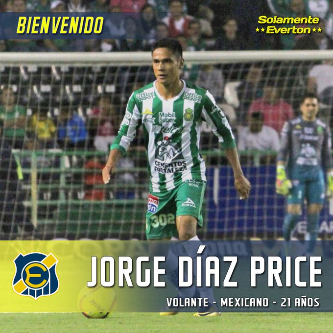 ¡Nueva incorporación!. Everton confirmó el arribo del volante ofensivo, proveniente del León, Jorge Diaz Price. El mexicano pondrá su firma durante los próximos días para vestir la oro y cielo en la temporada 2020.