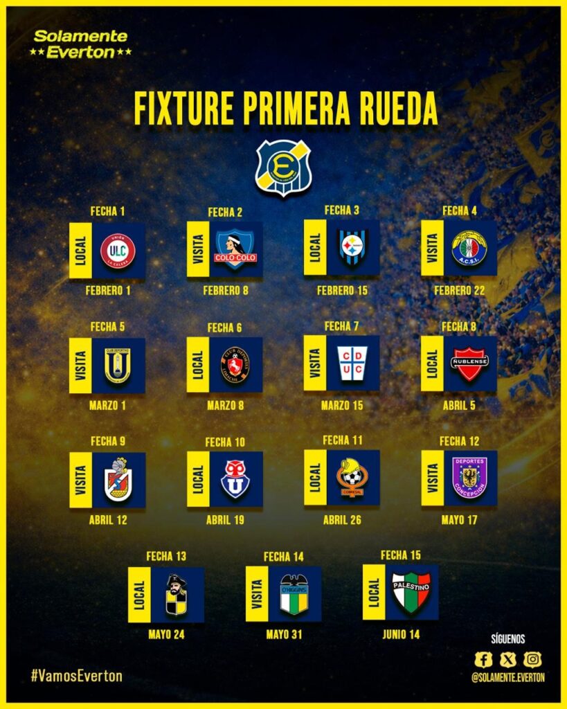 La primera rueda comenzará en el Estadio Sausalito, donde Everton recibirá a Unión La Calera en la fecha inicial. Durante este tramo del torneo, el equipo alternará encuentros dentro y fuera de Viña del Mar, buscando sumar puntos importantes y consolidar su rendimiento tanto en casa como en condición de visita.