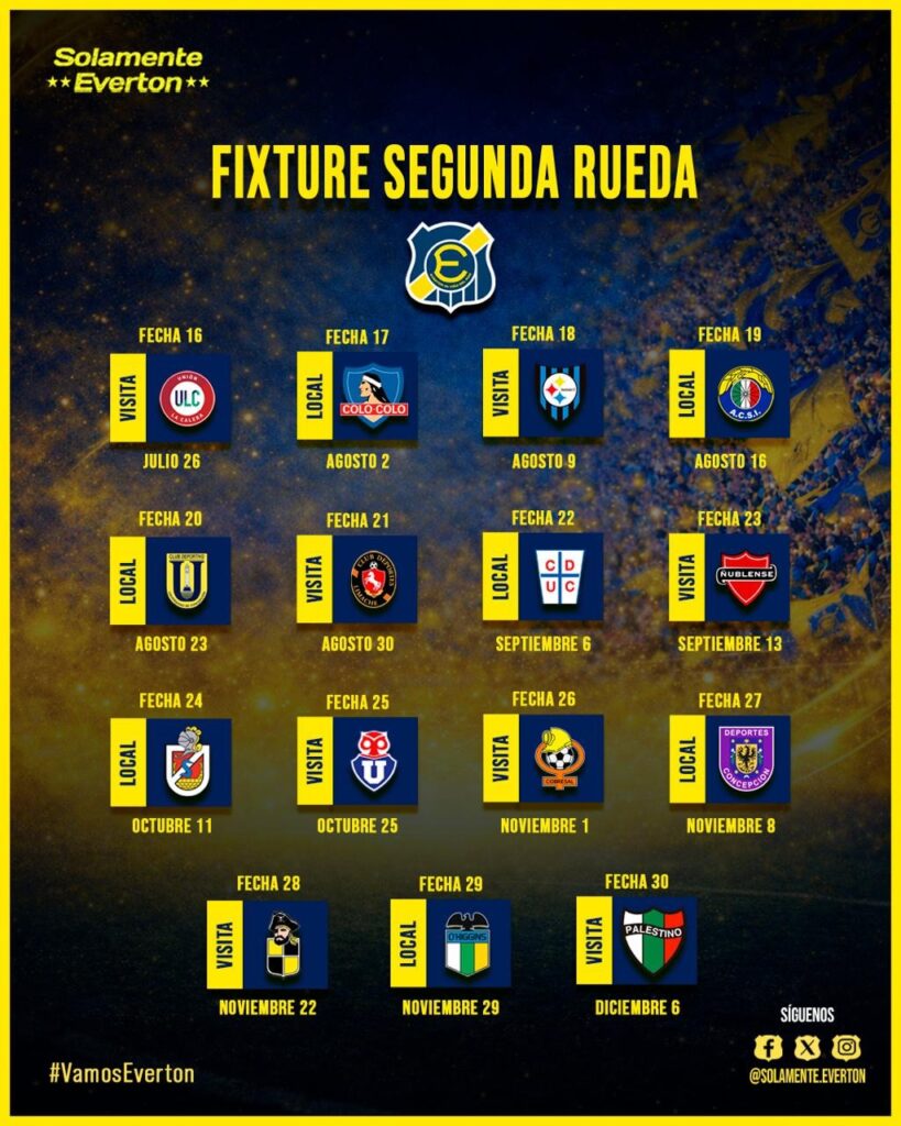 La segunda rueda presentará un escenario distinto y aún más desafiante. Everton iniciará esta fase jugando como visitante frente a Unión La Calera y, a diferencia de la primera parte del torneo, el campeonato volverá a cerrarse en calidad de visita, repitiendo el formato de temporadas anteriores.
